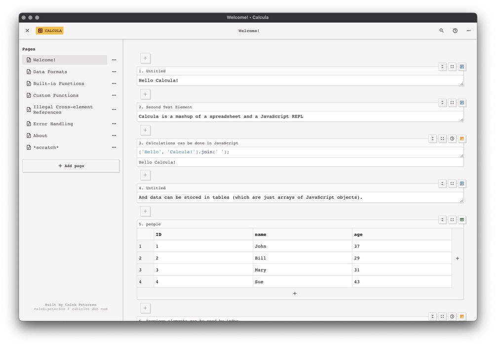 Calcula is a software tool for frontend developers that combines the functionality of a notebook with markdown support and a spreadsheet with a JavaScript eval environment.